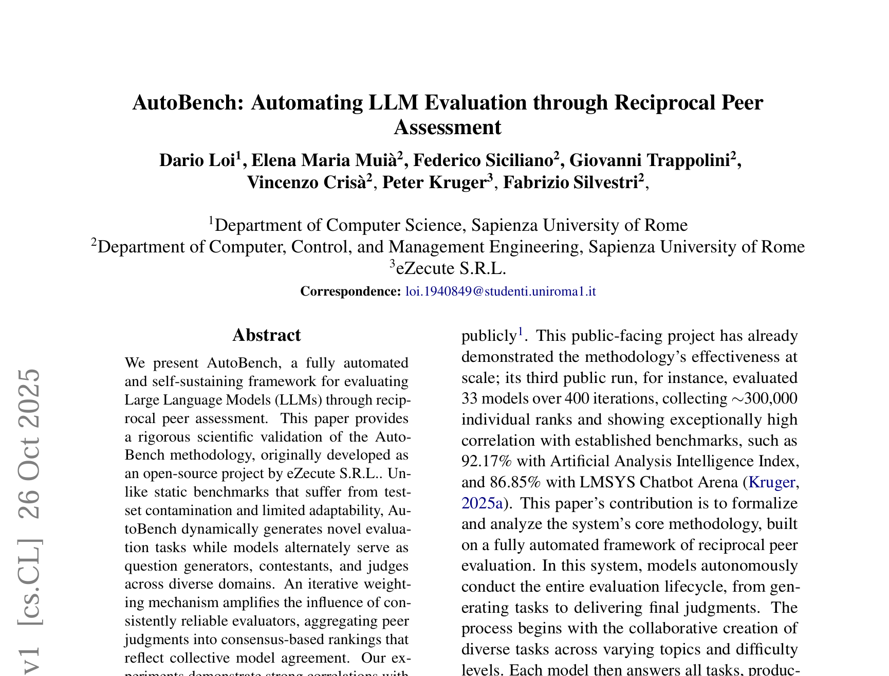 Today, we are thrilled to announce that this methodology has moved from a promising open-source project to a scientifically validated framework. We are releasing our first paper, "AutoBench: Automating LLM Evaluation through Reciprocal Peer Assessment", written in collaboration with a brilliant team of researchers from the Department of Computer, Control, and Management Engineering (DIAG) at Sapienza University of Rome.